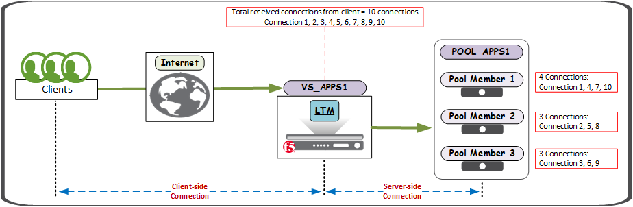 *Round Robin: Whenever VS_APPS1 receives incoming traffic from client, it will passes each new connection request to the next server in line, eventually distributing connections evenly across the array of pool members being load balanced.