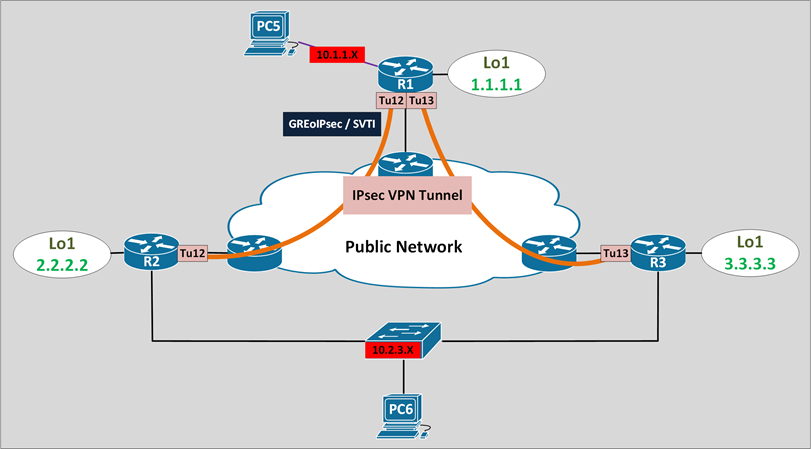 R1 is configured with 2 GREoIPsec Tunnels, failover options: